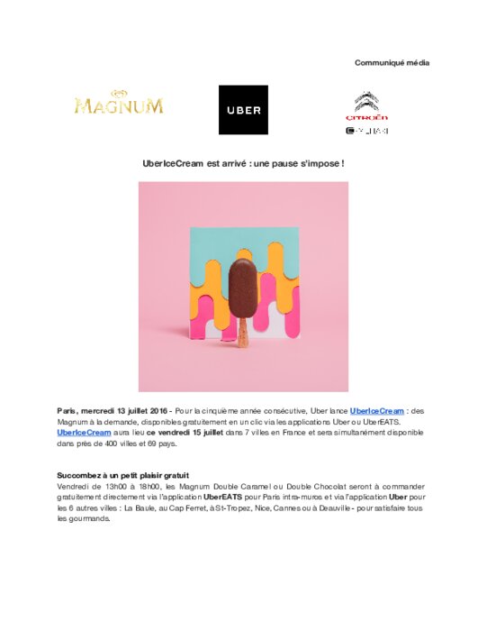 UberIceCream aura lieu ​ce vendredi 15 juillet ​dans 7 villes en France et sera simultanément disponible dans près de 400 villes et 69 pays.