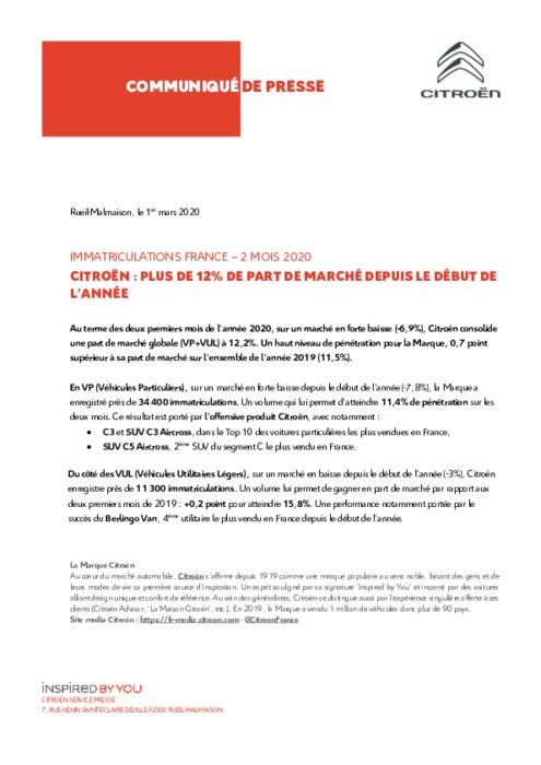 Au terme des deux premiers mois de l'année 2020, sur un marché en forte baisse (-6,9%), Citroën consolide une part de marché globale (VP+VUL) à 12,2%. Un haut niveau de pénétration pour la Marque, 0,7 point supérieur à sa part de marché sur l'ensemble de l'année 2019 (11,5%).