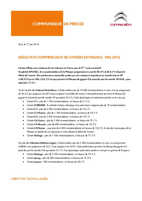 Citroën affiche une croissance de ses volumes en France pour le 5ème mois consécutif. Au global (VP+VUL), les immatriculations de la Marque progressent en mai de 30,4 % et de 8,3 % depuis le début de l’année. Une performance mensuelle portée par une croissance supérieure au marché tant en VP (+30,0 %) qu’en VUL (+32,2 %) et qui permet à la Marque de gagner 0,6 point de part de marché VP+VUL, pour atteindre 11,3 %.