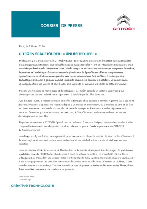 Moderne et plein de caractère, le CITROËN SpaceTourer apporte avec ses 3 silhouettes et ses possibilités d’aménagements intérieurs, une nouvelle réponse aux usages des « tribus » familiales ou amicales, mais aussi des professionnels. Nomade et dans l’air du temps, ce nouveau van associe sans compromis le confort, la praticité et l’esthétique. Grâce à sa nouvelle plateforme, le SpaceTourer offre un comportement dynamique et une efficience remarquables avec des consommations Best in Class.