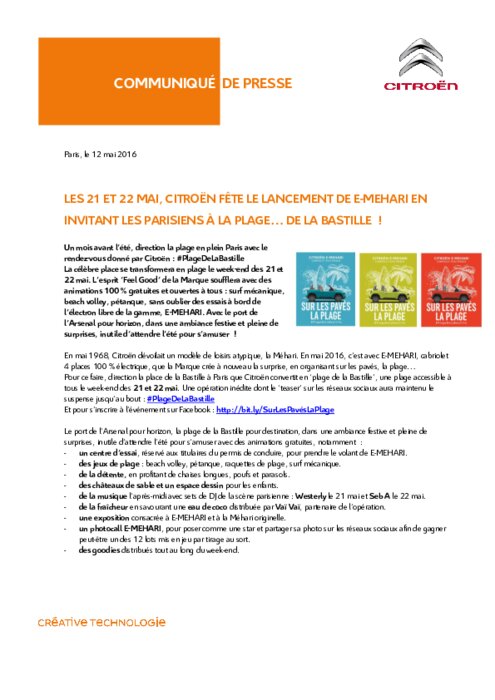 Un mois avant l’été, direction la plage en plein Paris avec le rendez-vous donné par Citroën : #PlageDeLaBastille. La célèbre place se transformera en plage le week-end des 21 et 22 mai. L’esprit ‘Feel Good’ de la Marque soufflera avec des animations 100 % gratuites et ouvertes à tous : surf mécanique, beach volley, pétanque, sans oublier des essais à bord de l’électron libre de la gamme, E-MEHARI.