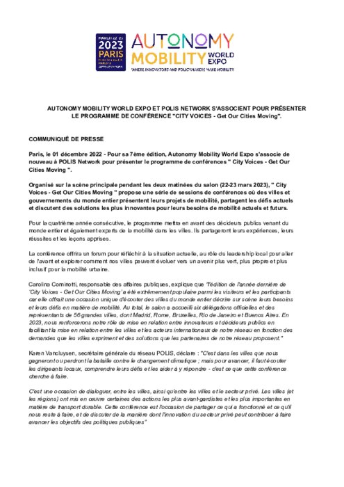 Pour sa 7ème édition, Autonomy Mobility World Expo s'associe de nouveau à POLIS Network pour présenter le programme de conférences " City Voices - Get Our Cities Moving ". Organisé sur la scène principale pendant les deux matinées du salon (22-23 mars 2023), " City Voices - Get Our Cities Moving " propose une série de sessions de conférences où des villes et gouvernements du monde entier présentent leurs projets de mobilité.