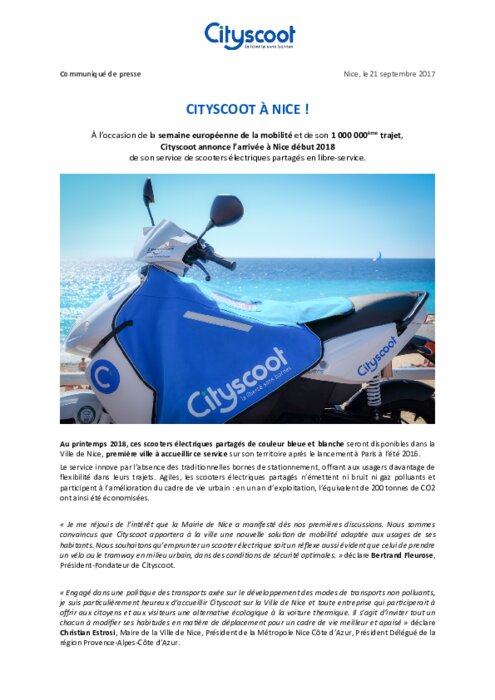 Services 22 septembre 2017 - 16:38 À l’occasion de la semaine européenne de la mobilité et de son 1 000 000 ème trajet, Cityscoot annonce l’arrivée à Nice début 2018 de son service de scooters électriques partagés en libre-service. PDF (237 Ko) Télécharger