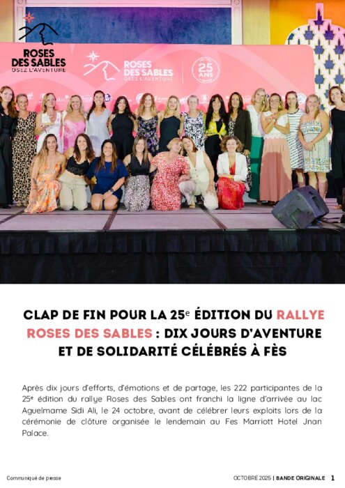 Après dix jours d’efforts, d’émotions et de partage, les 222 participantes de la 25ᵉ édition du rallye Roses des Sables ont franchi la ligne d’arrivée au lac Aguelmame Sidi Ali, le 24 octobre, avant de célébrer leurs exploits lors de la cérémonie de clôture organisée le lendemain au Fes Marriott Hotel Jnan Palace.