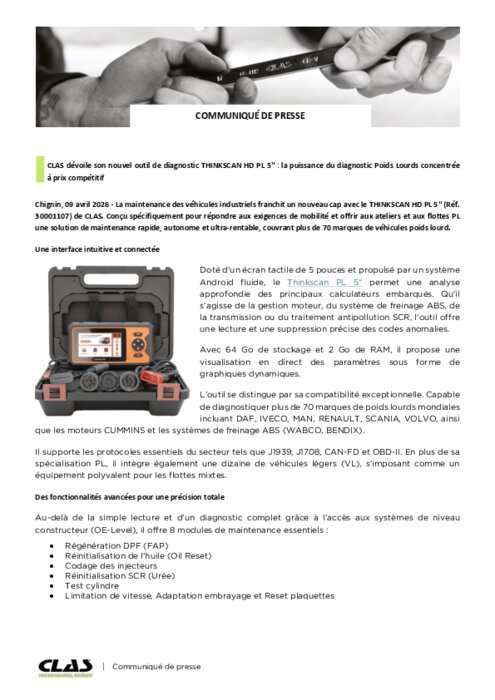 La maintenance des véhicules industriels franchit un nouveau cap avec le THINKSCAN HD PL 5" (Réf. 30001107) de CLAS. Conçu spécifiquement pour répondre aux exigences de mobilité et offrir aux ateliers et aux flottes PL une solution de maintenance rapide, autonome et ultra rentable, couvrant plus de 70 marques de véhicules poids lourd.