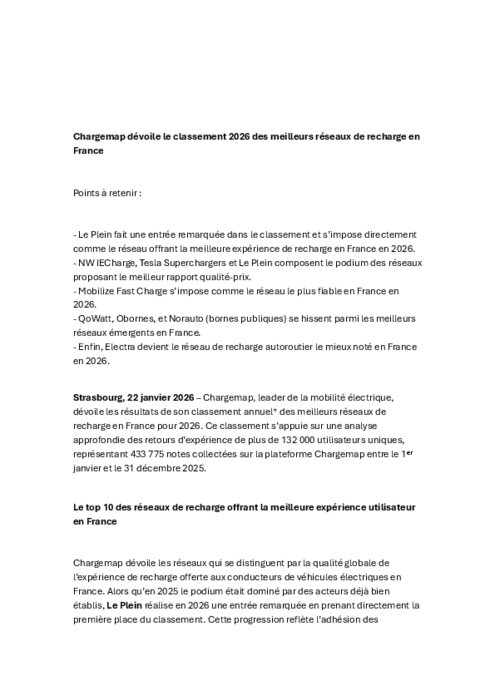 Chargemap, leader de la mobilité électrique, dévoile les résultats de son classement annuel* des meilleurs réseaux de recharge en France pour 2026. Ce classement s’appuie sur une analyse approfondie des retours d’expérience de plus de 132 000 utilisateurs uniques, représentant 433 775 notes collectées sur la plateforme Chargemap entre le 1ᵉʳ janvier et le 31 décembre 2025.
