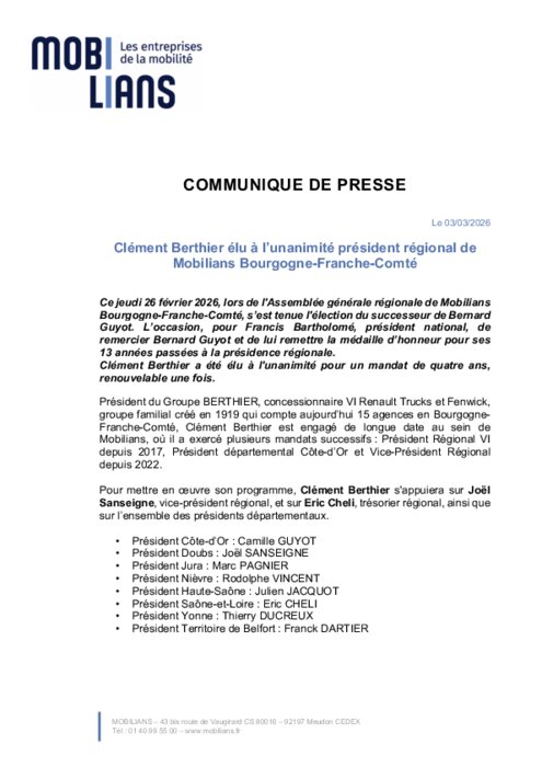 Ce jeudi 26 février 2026, lors de l'Assemblée générale régionale de Mobilians Bourgogne-Franche-Comté, s’est tenue l'élection du successeur de Bernard Guyot. L’occasion, pour Francis Bartholomé, président national, de remercier Bernard Guyot et de lui remettre la médaille d’honneur pour ses 13 années passées à la présidence régionale. Clément Berthier a été élu à l'unanimité pour un mandat de quatre ans,