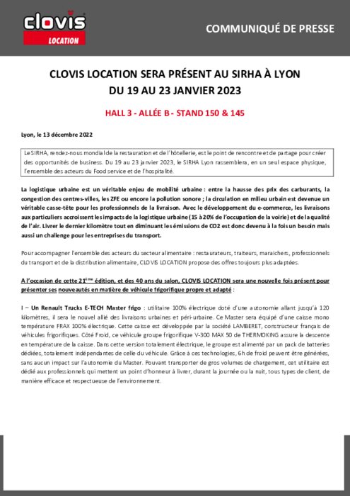 Pour accompagner l’ensemble des acteurs du secteur alimentaire : restaurateurs, traiteurs, maraichers, professionnels du transport et de la distribution alimentaire, CLOVIS LOCATION propose des offres toujours plus adaptées. A l’occasion de cette 21ème édition, et des 40 ans du salon, CLOVIS LOCATION sera une nouvelle fois présent pour présenter ses nouveautés en matière de véhicule frigorifique propre et adapté.