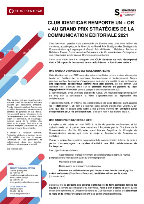 Services 22 septembre 2021 - 09:18 Club Identicar, premier club automobile de France avec plus d’un million de membres, a participé pour la 1ère fois au Grand Prix Stratégies des Stratégies de Communication . PDF (209 Ko) Télécharger