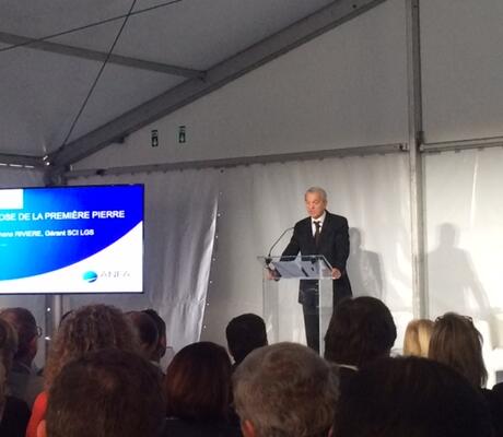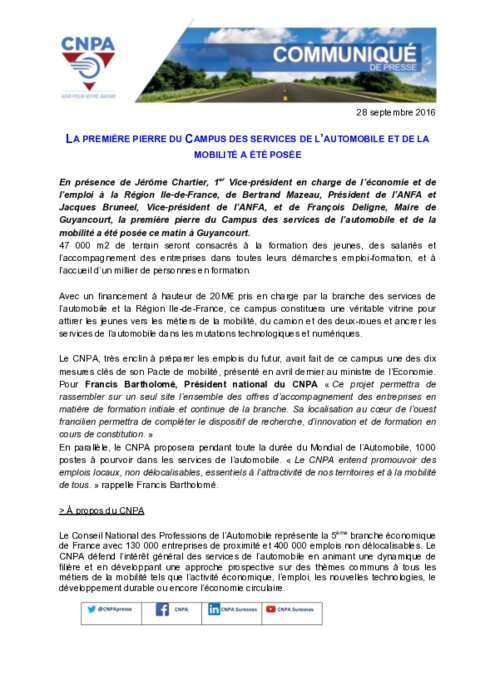 En présence de Jérôme Chartier, 1er Vice-président en charge de l'économie et de l'emploi à la Région Ile-de-France, de Bertrand Mazeau, Président de l'ANFA et Jacques Bruneel, Vice-président de l'ANFA, et de François Deligne, Maire de Guyancourt, la première pierre du Campus des services de l'automobile et de la mobilité a été posée ce matin à Guyancourt.
