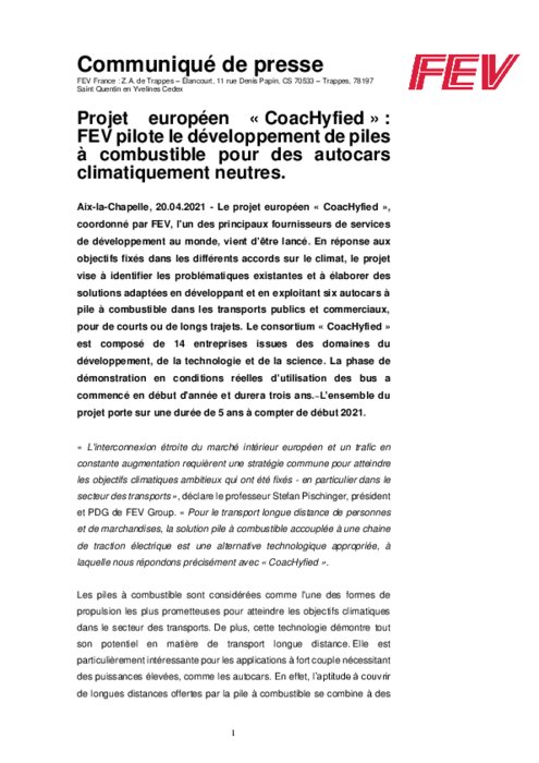 Le projet européen « CoacHyfied », coordonné par FEV, l'un des principaux fournisseurs de services de développement au monde, vient d’être lancé. En réponse aux objectifs fixés dans les différents accords sur le climat, le projet vise à identifier les problématiques existantes et à élaborer des solutions adaptées en développant et en exploitant six autocars à pile à combustible dans les transports publics et commerciaux, pour de courts ou de longs trajets...
