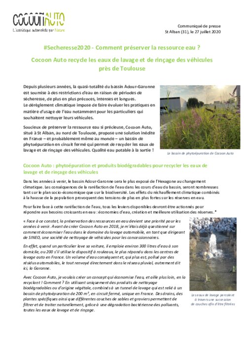 Soucieux de préserver la ressource eau si précieuse, Cocoon Auto, situé à St Alban, au nord de Toulouse, propose une solution inédite en France – et probablement même au monde – un bassin de phytoépuration en circuit fermé qui permet de recycler les eaux de lavage et de rinçage des véhicules. Qualité eau potable à la sortie !