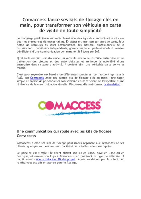 C’est pour répondre aux besoins de différentes structures, de l’autoentreprise à la PME, que Comaccess lance ses quatre kits de flocage clés en main : une façon simple et rapide de personnaliser son véhicule en bénéficiant de l’expertise d’une référence de la communication visuelle.