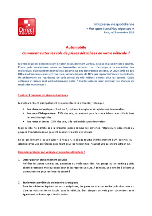 Les vols de pièces détachées sont en plein essor, devenant un fléau de plus en plus difficile à contrer.Phares, pots catalytiques, roues ou banquettes arrière… rien n’échappe à la convoitise des malfaiteurs, qui revendent leur butin à bas prix sur des plateformes en ligne. En 2024, près de 100 000 vols d’accessoiresont été recensés, soit une hausse de 10 %par rapport à l’année précédente. Un phénomène qui représente un coût annuel de 600 millions d’euros pour les assurés. Quels véhicules et pièces sont particulièrement ciblés ? Quelles astuces pour diminuer les chances de succès des malfaiteurs? Les réponses de Direct Assurance dans le document en pièce jointe.
