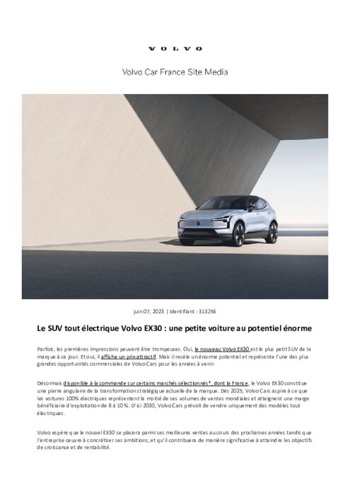 Parfois, les premières impressions peuvent être trompeuses. Oui, le nouveau Volvo EX30 est le plus petit SUV de la marque à ce jour. Et oui, il affiche un prix attractif. Mais il recèle un énorme potentiel et représente l’une des plus grandes opportunités commerciales de Volvo Cars pour les années à venir. Désormais disponible à la commande sur certains marchés sélectionnés*, dont la France, le Volvo EX30 constitue une pierre angulaire de la transformation stratégique actuelle de la marque.