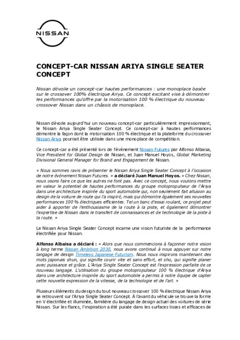 Nissan dévoile un concept-car hautes performances : une monoplace basée sur le crossover 100% électrique Ariya. Ce concept excitant vise à démontrer les performances qu’offre par la motorisation 100 % électrique du nouveau crossover Nissan dans un châssis de monoplace.