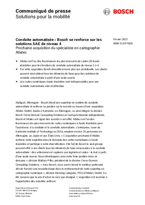 Bosch étend son expertise en matière de conduite automatisée et renforce sa position sur le marché au travers d’une acquisition. Atlatec, basée à Karlsruhe, en Allemagne, va ainsi intégrer la division Bosch Cross-Domain Computing Solutions en tant qu’entreprise indépendante. Bosch et Atlatec ont signé des accords à cet effet. Atlatec est l’un des fournisseurs les plus innovants de cartes numériques à haute résolution pour l’assistance à la conduite et la conduite automatisée...