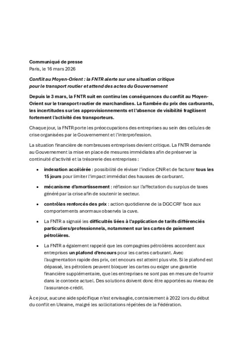 Depuis le 3 mars, la FNTR suit en continu les conséquences du conflit au Moyen-Orient sur le transport routier de marchandises. La flambée du prix des carburants, les incertitudes sur les approvisionnements et l’absence de visibilité fragilisent fortement l’activité des transporteurs.