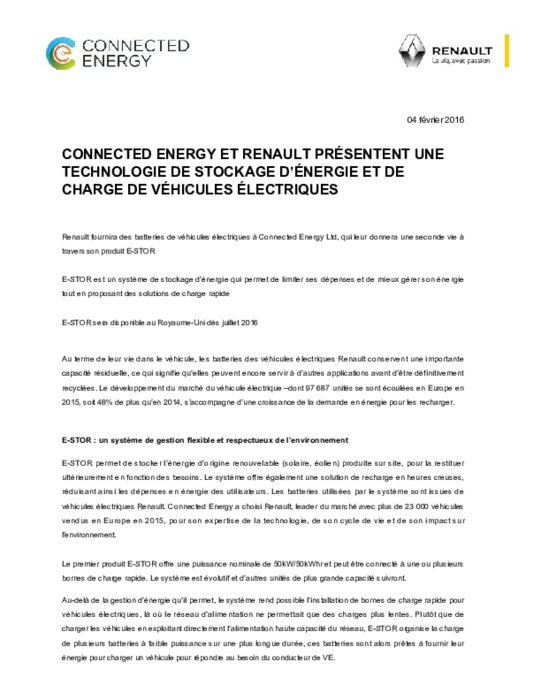 Renault fournira des batteries de véhicules électriques à Connected Energy, qui leur donnera une seconde vie à travers son produit E-STOR. E-STOR est un système de stockage d’énergie qui permet de limiter ses dépenses et de mieux gérer son énergie tout en proposant des solutions de charge rapide. E-STOR sera disponible au Royaume-Uni dès juillet 2016.