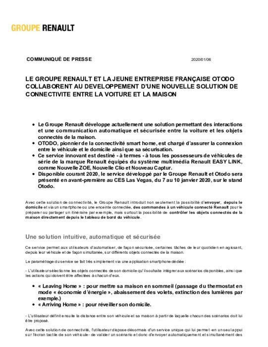 Avec cette solution de connectivité, le Groupe Renault introduit non seulement la possibilité d'envoyer, depuis le domicile et via un smartphone ou une enceinte connectée, des commandes à un véhicule connecté Renault pour le préparer ou partager un itinéraire par exemple, mais surtout la possibilité de contrôler les objets connectés de la maison directement depuis le tableau de bord du véhicule.