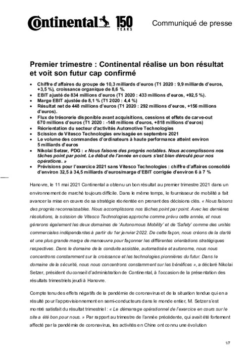 Continental a obtenu un bon résultat au premier trimestre 2021 dans un environnement de marché toujours difficile. Dans le même temps, le fournisseur de mobilité a fait avancer la mise en œuvre de sa stratégie réorientée en prenant des décisions clés.