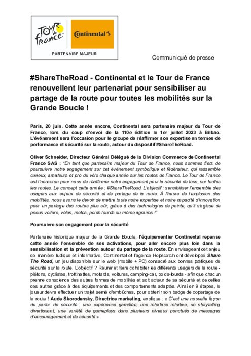 Cette année encore, Continental sera partenaire majeur du Tour de France, lors du coup d’envoi de la 110e édition le 1er juillet 2023 à Bilbao. L’événement sera l’occasion pour le groupe de réaffirmer son expertise en termes de performance et sécurité sur la route, autour du dispositif #ShareTheRoad.