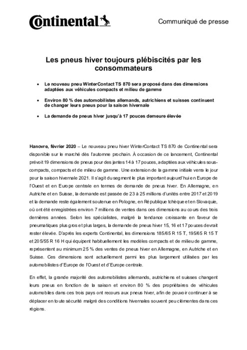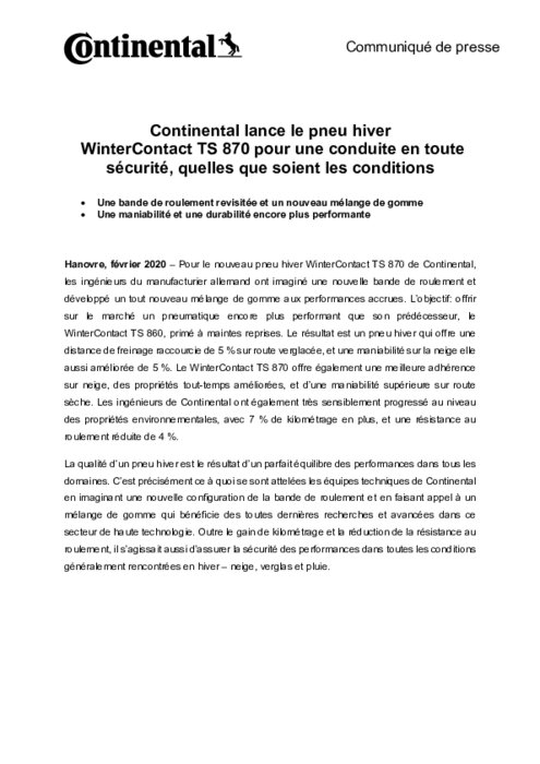 Le nouveau pneu hiver WinterContact TS 870 de Continental sera disponible sur le marché dès l’automne prochain. À occasion de ce lancement, Continental prévoit 19 dimensions de pneus pour des jantes 14 à 17 pouces, adaptées aux véhicules sous-compacts, compacts et de milieu de gamme. Une extension de la gamme initiale verra le jour pour la saison hivernale 2021. Il s’agit du segment le plus important aujourd’hui en Europe de l’Ouest et en Europe centrale en terme de demandes de pneus hiver.