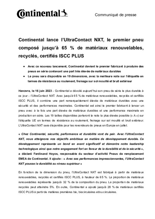 Avec ce nouveau lancement, Continental devient le premier fabricant à produire des pneus en série contenant une part très élevée de matériaux durables. Le pneu sera disponible en 19 dimensions, avec la meilleure note sur l’étiquette en termes de résistance au roulement, freinage sur sol mouillé et bruit extérieur. Continental a dévoilé aujourd’hui son pneu de série le plus durable à ce jour - l’UltraContact NXT. Avec jusqu’à 65 % de matériaux renouvelables, recyclés et certifié ISCC PLUS.