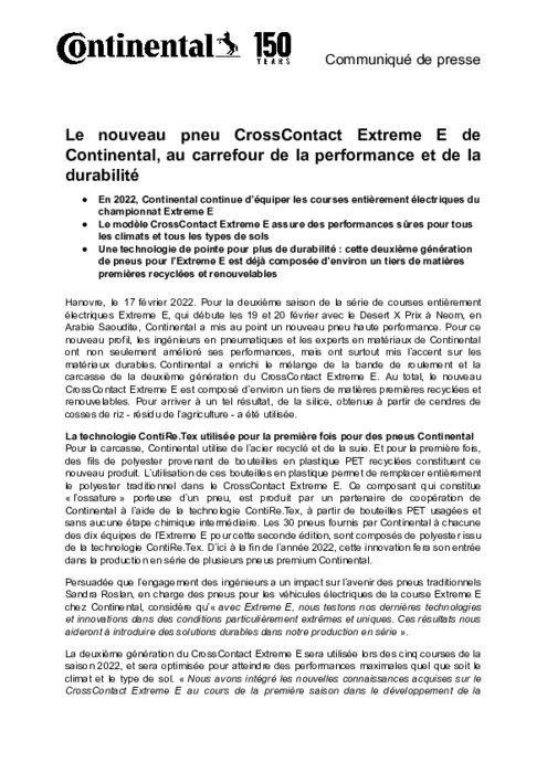 Pour la deuxième saison de la série de courses entièrement électriques Extreme E, qui débute les 19 et 20 février avec le Desert X Prix à Neom, en Arabie Saoudite, Continental a mis au point un nouveau pneu haute performance. Pour ce nouveau profil, les ingénieurs en pneumatiques et les experts en matériaux de Continental ont non seulement amélioré ses performances, mais ont surtout mis l’accent sur les matériaux durables. Continental a enrichi le mélange de la bande de roulement et la carcasse.