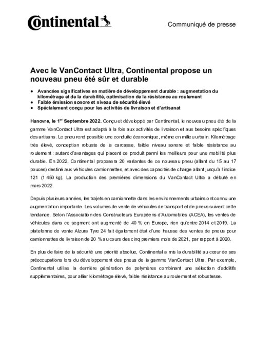 Conçu et développé par Continental, le nouveau pneu été de la gamme VanContact Ultra est adapté à la fois aux activités de livraison et aux besoins spécifiques des artisans. Le pneu rend possible une conduite économique, même en milieu urbain. Kilométrage très élevé, conception robuste de la carcasse, faible niveau sonore et faible résistance au roulement : autant d’avantages qui placent ce produit parmi les meilleurs pour une mobilité plus durable.