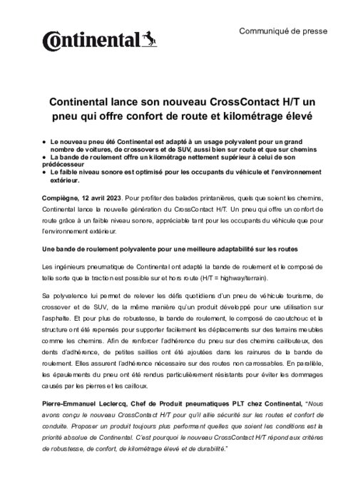 Pour profiter des balades printanières, quels que soient les chemins, Continental lance la nouvelle génération du CrossContact H/T. Un pneu qui offre un confort de route grâce à un faible niveau sonore, appréciable tant pour les occupants du véhicule que pour l’environnement extérieur.