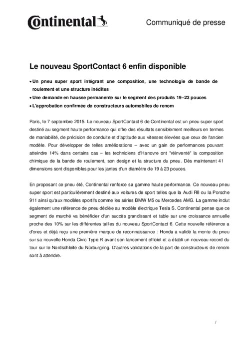 Le nouveau SportContact 6 de Continental est un pneu super sport destiné au segment haute performance qui offre des résultats sensiblement meilleurs en termes de maniabilité, de précision de conduite et d'aptitude aux vitesses élevées que ceux de l'ancien modèle. Pour développer de telles améliorations – avec un gain de performances pouvant atteindre 14% dans certains cas – les techniciens d'Hanovre ont "réinventé" la composition chimique de la bande de roulement et son design.