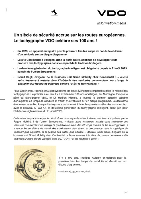 Pour Continental, l'année 2023 est synonyme de deux événements importants dans le monde des tachygraphes. Le premier a eu lieu il y a exactement 100 ans à Villingen, en Allemagne, lorsque le père du tachygraphe VDO, le Dr Herbert Kienzle, a inventé le premier appareil capable d'enregistrer les temps de conduite et d'arrêt d'un véhicule sur un disque diagramme. Le deuxième événement a eu lieu lorsque l'entreprise a commencé à livrer les premiers véhicules commerciaux avec le nouveau DTCO 4.1, la deuxième génération du tachygraphe intelligent, début juin pour l'échéance réglementaire du 21 août 2023.
