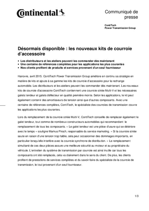 ContiTech Power Transmission Group améliore en continu sa stratégie en matière de kits et ajoute à sa gamme les kits de courroie d’accessoire pour la rechange automobile. Les distributeurs et les ateliers peuvent les commander dès maintenant. Les nouveaux kits de courroie d’accessoire ContiTech contiennent une courroie striée Multi-V et les nécessaires galets tendeur et galets déflecteur en qualité première monte.