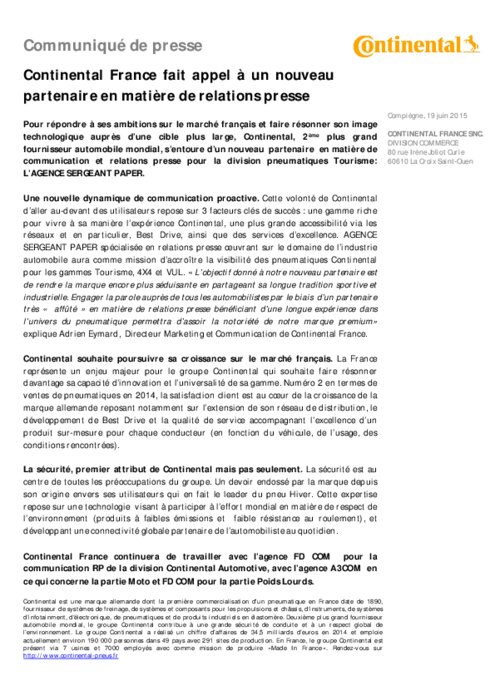 Pour répondre à ses ambitions sur le marché français et faire résonner son image technologique auprès d’une cible plus large, Continental, 2ème plus grand fournisseur automobile mondial, s’entoure d’un nouveau partenaire en matière de communication et relations presse pour la division pneumatiques Tourisme : L’AGENCE SERGEANT PAPER.
