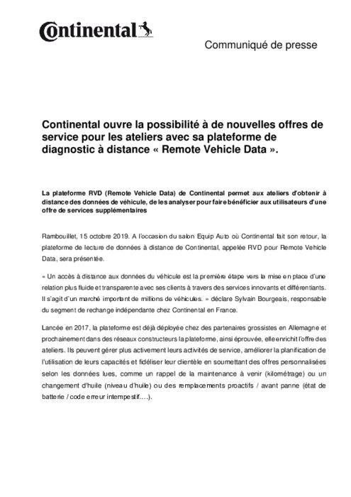 Equipementiers 16 octobre 2019 - 15:17 La plateforme RVD (Remote Vehicle Data) de Continental permet aux ateliers d’obtenir à distance des données de véhicule, de les analyser pour faire bénéficier aux utilisateurs d’une offre de services supplémentaires. Cliquez ici pour retrouver toutes les infos Equip Auto 2019 PDF (264 Ko) Télécharger