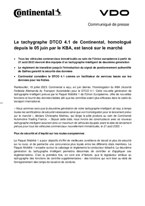 Continental a reçu, en juin dernier, l'homologation du KBA (Autorité Fédérale Allemande du Transport Automobile) pour le DTCO 4.1. Cette nouvelle génération de tachygraphe intelligent prévue par le Paquet Mobilité 1 de l'Union Européenne, offre de nouvelles fonctions et fournit des données fiables afin que les contrôles soient plus efficaces dans le cadre du transport international.