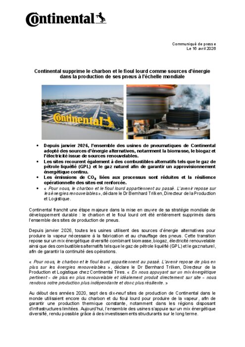 Depuis janvier 2026, l’ensemble des usines de pneumatiques de Continental adopté des sources d’énergie alternatives, notamment la biomasse, le biogaz et l’électricité issue de sources renouvelables. Les sites recourent également à des combustibles alternatifs tels que le gaz de pétrole liquéfié (GPL) et le gaz naturel afin de garantir un approvisionnement énergétique continu. Les émissions de CO₂
