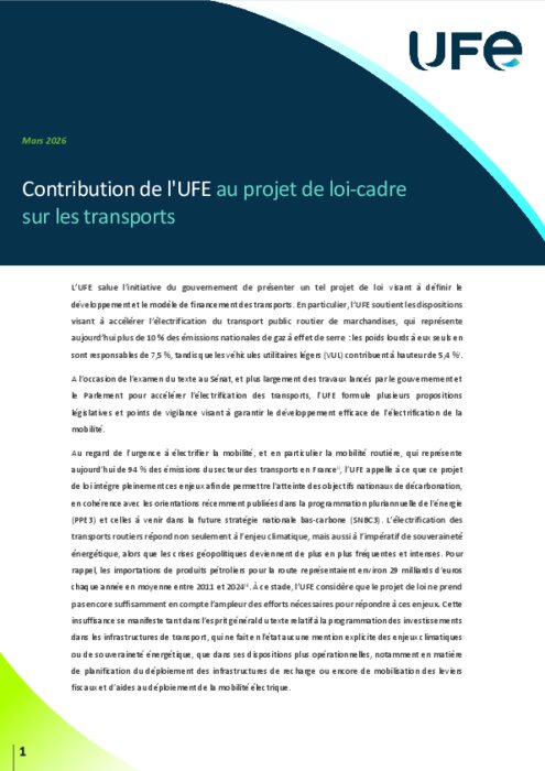 Alors que l'examen du projet de loi-cadre sur les transports débute le 7 avril au Sénat, l'UFE publie ses propositions pour faire de ce texte un levier réel en faveur du déploiement de l’électromobilité et répondre aux enjeux suivants : amélioration de la compétitivité des entreprises, lutte contre le changement climatique et renforcement de notre souveraineté énergétique.