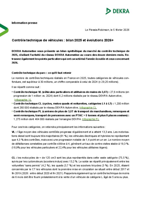 DEKRA Automotive vous présente un bilan synthétique du marché du contrôle technique de 2025, révélant l’activité du réseau DEKRA Automotive au cours des douze derniers mois. Retrouvez également les points particuliers qui ont caractérisé l’année écoulée et ceux concernant 2026.