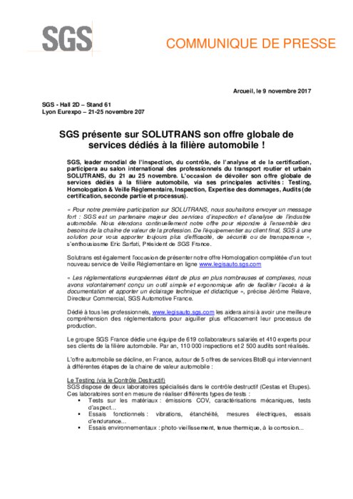 SGS, leader mondial de l’inspection, du contrôle, de l’analyse et de la certification, participera au salon international des professionnels du transport routier et urbain SOLUTRANS, du 21 au 25 novembre. L’occasion de dévoiler son offre globale de services dédiés à la filière automobile, via ses principales activités : Testing, Homologation & Veille Réglementaire, Inspection, Expertise des dommages, Audits (de certification, seconde partie et processus).