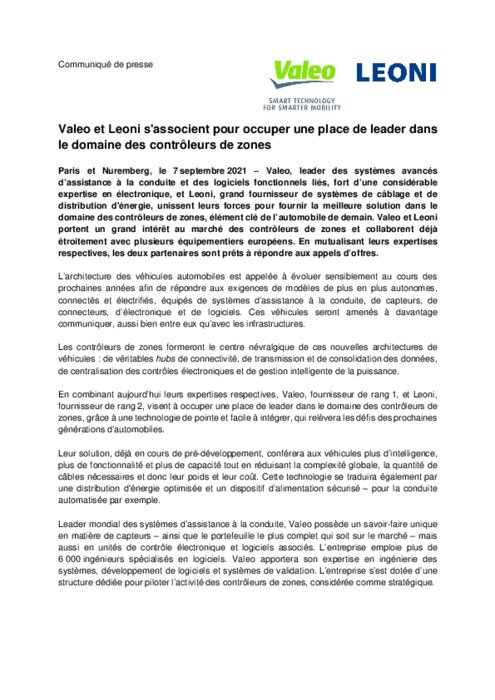 Valeo, leader des systèmes avancés d’assistance à la conduite et des logiciels fonctionnels liés, fort d’une considérable expertise en électronique, et Leoni, grand fournisseur de systèmes de câblage et de distribution d'énergie, unissent leurs forces pour fournir la meilleure solution dans le domaine des contrôleurs de zones, élément clé de l’automobile de demain. Valeo et Leoni portent un grand intérêt au marché des contrôleurs de zones...