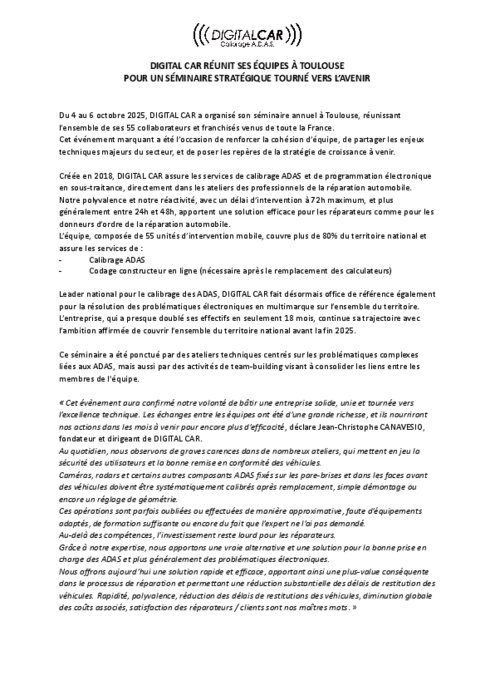 Créée en 2018, DIGITAL CAR assure les services de calibrage ADAS et de programmation électronique en sous-traitance, directement dans les ateliers des professionnels de la réparation automobile. La polyvalence et la réactivité, avec un délai d’intervention à 72h maximum, et plus généralement entre 24h et 48h, apportent une solution efficace pour les réparateurs comme pour les donneurs d’ordre de la réparation automobile.