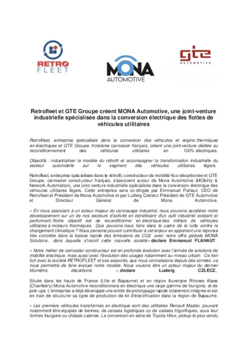 Retrofleet, entreprise spécialisée dans le rétrofit, constructeur de mobilité €co-décarbonée et GTE Groupe, carrossier constructeur français, s'associent autour de Mona Automotive (MObility & Network Automation), une joint-venture industrielle spécialisée dans la conversion électrique des véhicules utilitaires légers.
