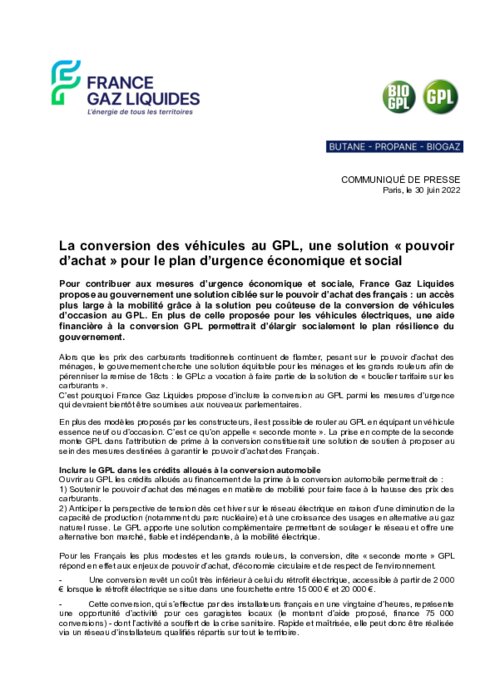 Pour contribuer aux mesures d’urgence économique et sociale, France Gaz Liquides propose au gouvernement une solution ciblée sur le pouvoir d’achat des français : un accès plus large à la mobilité grâce à la solution peu coûteuse de la conversion de véhicules d’occasion au GPL. En plus de celle proposée pour les véhicules électriques, une aide financière à la conversion GPL permettrait d’élargir socialement le plan résilience du gouvernement.