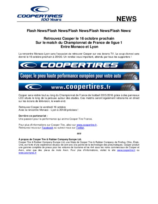 Equipementiers 13 octobre 2015 - 11:42 La rencontre Monaco-Lyon sera l’occasion de retrouver Cooper sur vos écrans TV. Le coup d’envoi sera donné le 16 octobre à 20h30. Un rendez-vous important, attendu par tous les supporters ! PDF (160 Ko) Télécharger
