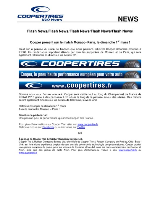 Equipementiers 25 février 2015 - 11:13 C’est sur la pelouse du stade de Monaco que nous pourrons retrouver Cooper dimanche prochain à 21h00. Un rendez-vous important attendu par tous les supporters de Monaco et de Paris, qui sera également retransmis en direct sur les écrans TV. PDF (159 Ko) Télécharger