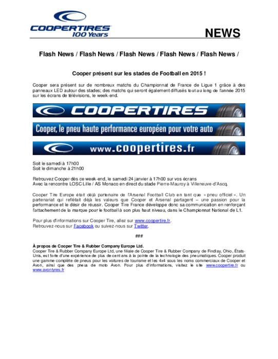 Cooper sera présent sur de nombreux matchs du Championnat de France de Ligue 1 grâce à des panneaux LED autour des stades; des matchs qui seront également diffusés tout au long de l’année 2015 sur les écrans de télévisions, le week-end.