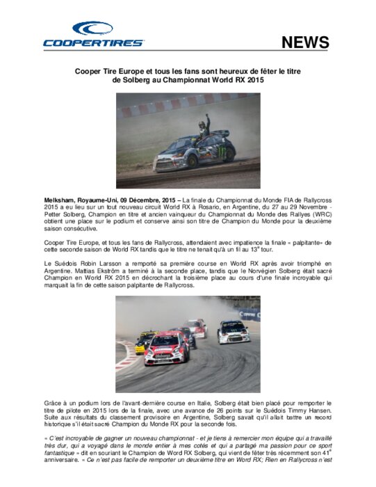 La finale du Championnat du Monde FIA de Rallycross 2015 a eu lieu sur un tout nouveau circuit World RX à Rosario, en Argentine, du 27 au 29 Novembre. Petter Solberg, Champion en titre et ancien vainqueur du Championnat du Monde des Rallyes (WRC) obtient une place sur le podium et conserve ainsi son titre de Champion du Monde pour la deuxième saison consécutive.