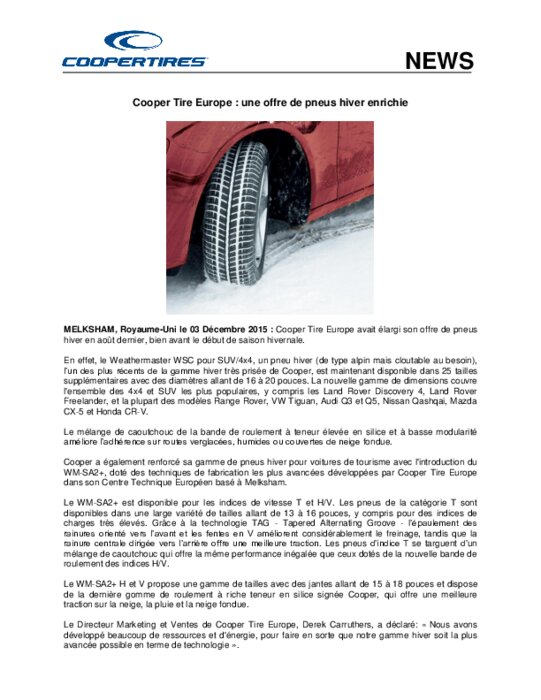 Cooper Tire Europe avait élargi son offre de pneus hiver en août dernier, bien avant le début de saison hivernale. En effet, le Weathermaster W SC pour SUV/4x4, un pneu hiver (de type alpin mais cloutable au besoin), l’un des plus récents de la gamme hiver très prisée de Cooper, est maintenant disponible dans 25 tailles supplémentaires avec des diamètres allant de 16 à 20 pouces. La nouvelle gamme de dimensions couvre l'ensemble des 4x4 et SUV les plus populaires.